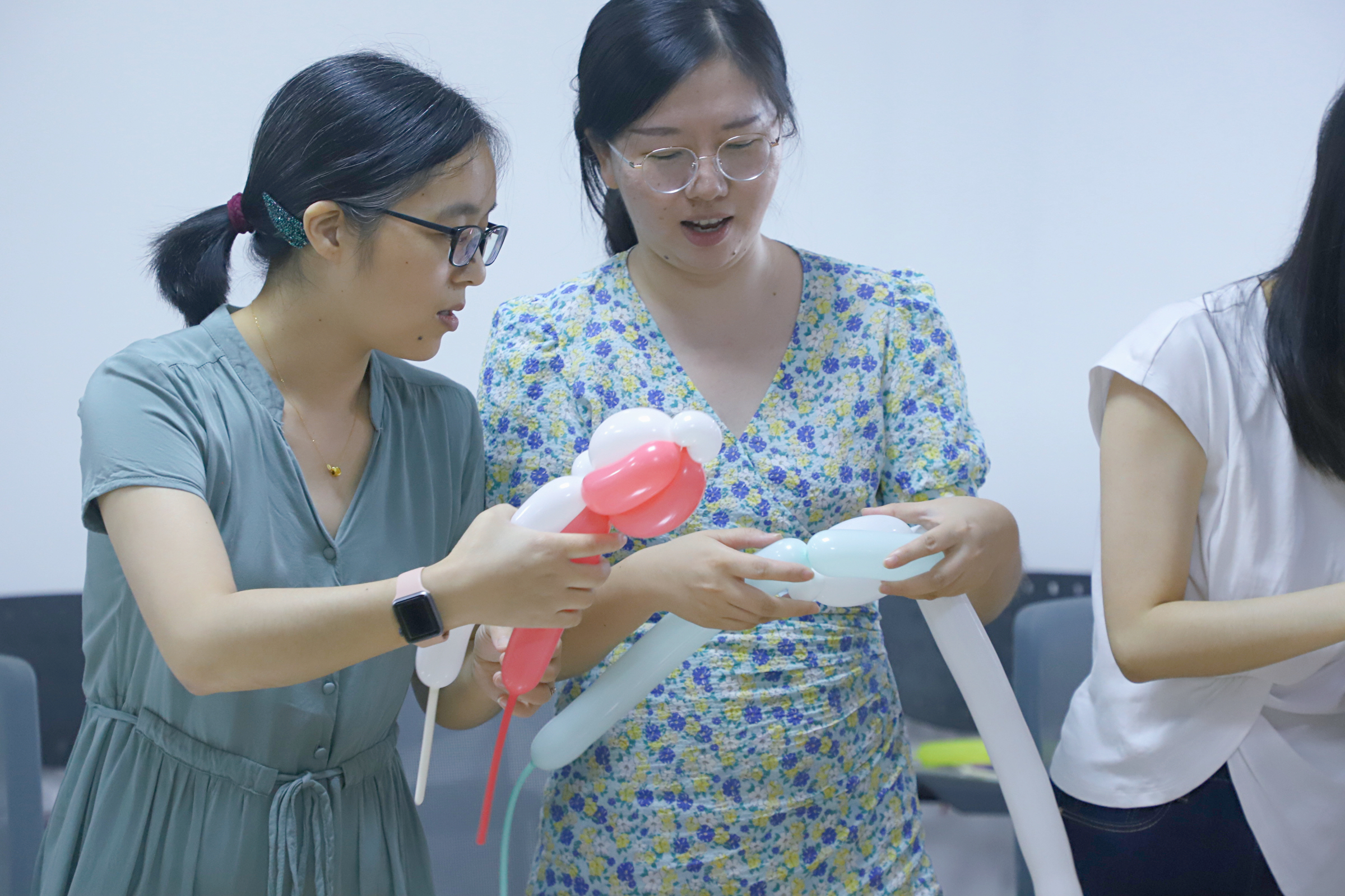 五彩的氣球構建了最美的夢,受邀的專業老師向大家分享了如何打氣球、綁氣球的知識點,講解氣球造型的基本技巧,幫助大家把握氣球旋轉的方向和力度,在老師的幫助和指點下,大家很快投入到了動手制作中,從一開始的生疏、害怕氣球爆炸到慢慢掌握了基礎手法,粘膠、拼貼、配色加上自己的一些奇思妙想,雖不時有氣球“嘭嘭”爆破的聲音,但大家熱情高漲,時間不知不覺過去,一件件作品也逐漸呈現在眼前,看似相同卻也不盡相同。
