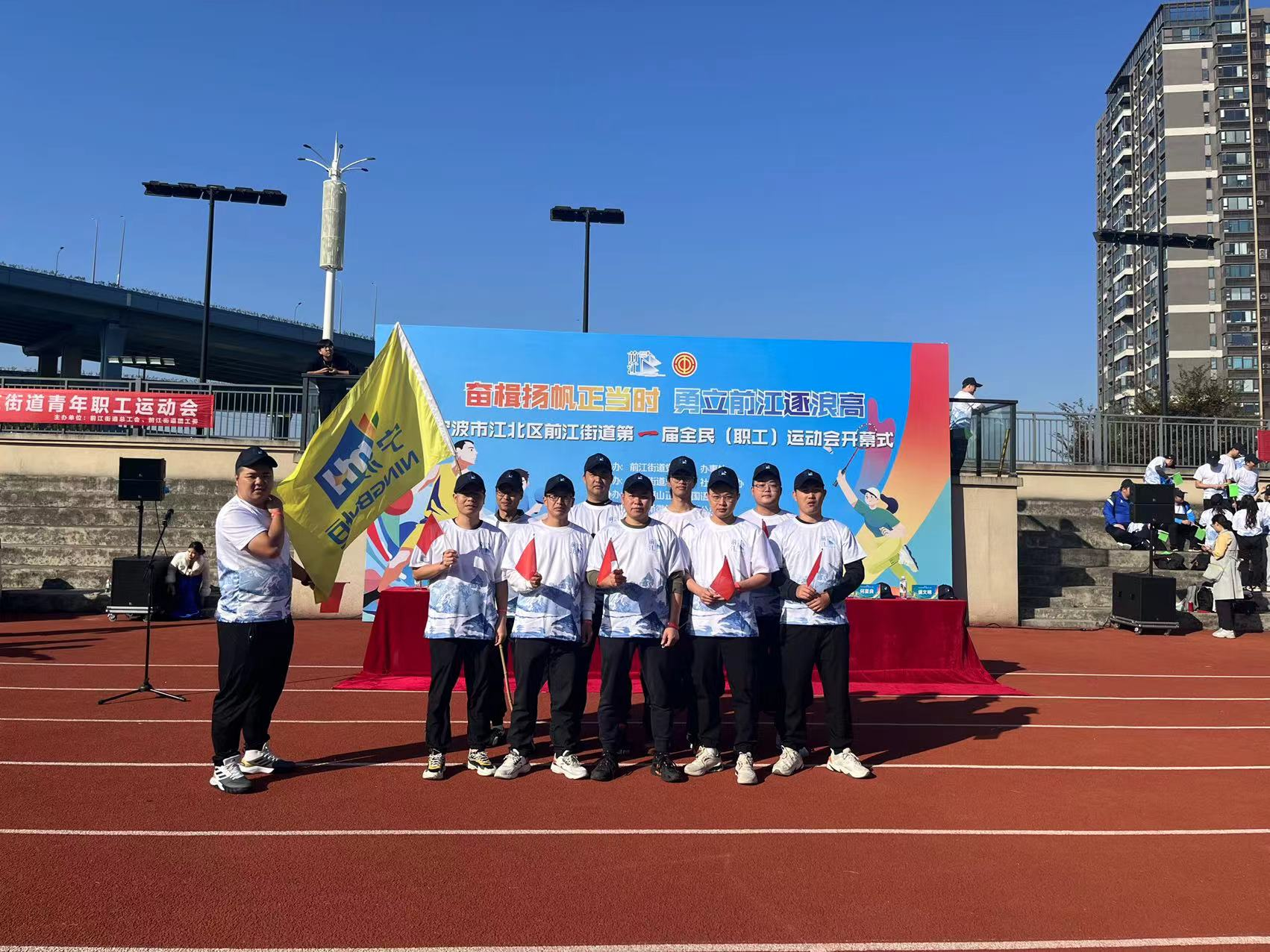 近日,“奮楫揚帆正當時·勇立前江逐浪高”寧波市江北區前江街道第一屆全民(職工)運動會開幕式在寧波福山正達外國語學校舉行。來自轄區11家企業、街道機關、社區、村的170名參賽選手來到現場,共計17支代表隊參賽,萌恒一隊10名隊員組成代表隊參賽。
