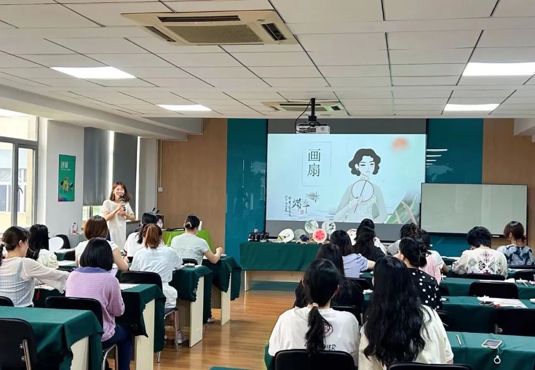 活動現場,指導老師介紹了團扇的由來和美好寓意,耐心地講解手繪團扇的步驟、繪制要點、色彩搭配等知識。隨后大家釋放靈感,一筆一劃描繪得格外認真。不一會,素白的扇面漸漸被點綴,一把把趣味盎然的團扇便完成了,有的仙氣飄飄、有的嬌艷動人、有的自由隨性,所有的祈福和寄托都化作了絢麗的色彩,一柄素扇,幾只彩筆,手繪清涼,濃情端午。